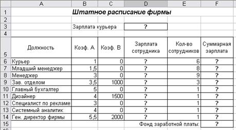 Задание 4.2. Используя режим подбора параметра, определить штатное расписания фирмы. Исходные данные приведены на рис. 4.4.