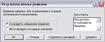 Запустите процесс поиска решения нажатием кнопки Выполнить. В открывшемся диалоговом окне Результаты поиска решения задайте опцию Сохранить найденное решение (рис. 5.4).