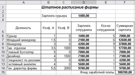 2. Создайте таблицу штатного расписания фирмы по приведенному образцу (см. рис. 4.4). Введите исходные данные в рабочий лист электронной книги.