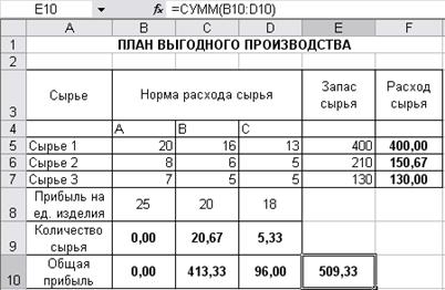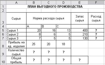 Обратите внимание, что значения количества сырья каждого вида пока не известны и будут подобраны в процессе решения задания (ячейки B9:D9 пока пустые).