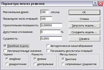 Установите параметры поиска решения (рис. 5.8). Для этого кнопкой Параметры откройте диалоговое окно Параметры поиска решения, установите параметры по образцу, задайте линейную модель расчета (Линейность модели).
