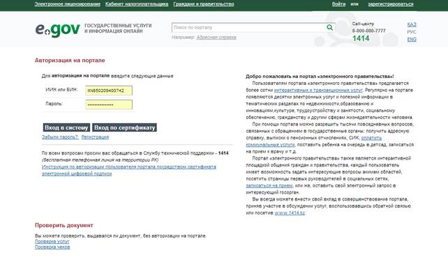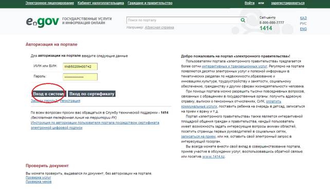 Для авторизации необходимо ввести ИИН, указать пароль нажать на кнопку «Вход в систему» либо нажать на кнопку «Вход по сертификату».