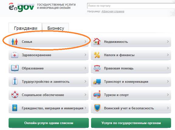 Для получения услуги, необходимо выбрать раздел «Семья» (см. рис. 5)