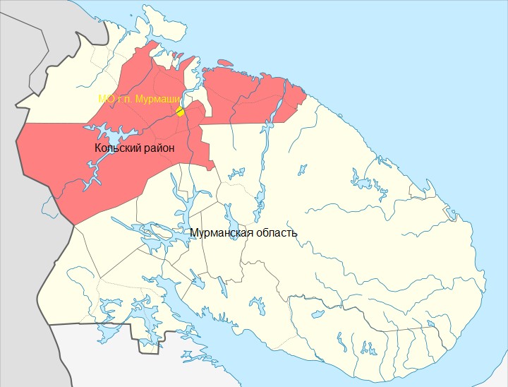 Рисунок 1. Расположение муниципального образования городское поселение Мурмаши в границах Мурманской области и Кольского района.