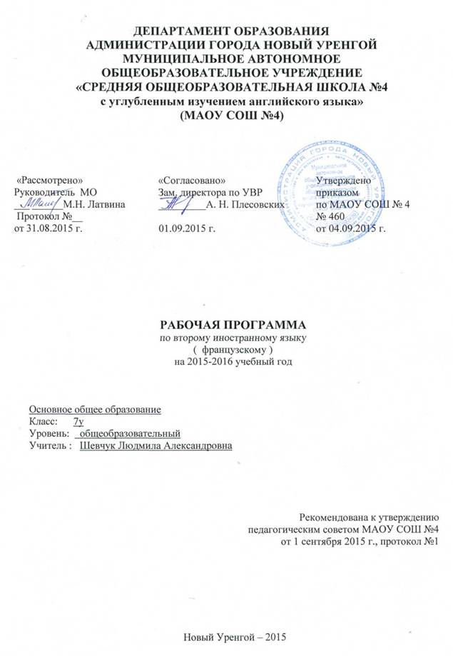 Рабочие программы учебного предмета ««Второй иностранный язык (французский)»в 7у классе составлена на основании следующих нормативно-правовых документов: Федеральный закон «Об образовании в Российской Федерации» от 29 декабря 2012 года (ред. от 23.07.13); Примерная программа общеобразовательных учреждений (основная школа) по предмету «Французский язык», созданной в рамках проекта "Разработка, апробация и внедрение федеральных государственных стандартов общего образования второго поколения", созданной Российской академией образования по заказу Министерства образования и науки Российской Федерации, М., 2010 г. ; Приказ Министерства образования и науки РФ от 01.01.2001 г. № 000 «Об утверждении федеральных перечней учебников, рекомендованных (допущенных) к использованию в образовательном процессе в образовательных учреждениях, реализующих образовательные программы общего образования и имеющих государственную аккредитацию на 2014-2015 учебный год»; Образовательная программа МАОУ СОШ №4 г. Новый Уренгой.