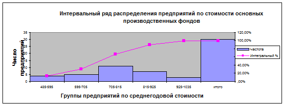 5. Построить интервальный вариационный ряд и гистограмму распределения единиц совокупности по признаку Среднегодовая стоимость основных производственных фондов и установить характер (тип) этого распределения. Рассчитать моду Мо полученного интервального ряда и сравнить ее с показателем Мо несгруппированного ряда данных.