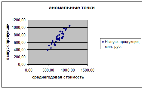 Задача 1. Выявим наличие среди исходных данных резко выделяющихся значений признаков («выбросов» данных) с целью исключения из выборки аномальных единиц наблюдения, используя диаграмму рассеяния. Аномальных единиц наблюдения 2 – см. Табл.2 (ПРИЛОЖЕНИЕ 1)