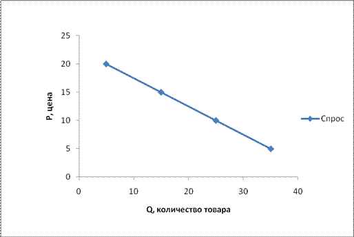 3. График спроса строим по точкам из шкалы спроса (рис. 2.1). В нашем примере четыре точки (Р = 5, Q = 35; Р = 10, Q = 25; Р = 15, Q = 15; Р = 20, Q = 5).