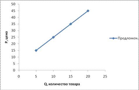3. График предложения строим по точкам из шкалы предложения (рис. 2.2). В нашем примере четыре точки (Р = 5, Q = 15; Р = 10, Q = 25; Р = 15, Q = 35; Р = 20, Q = 45).
