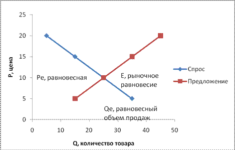 Отсюда мы узнаём равновесную цену: Ре = 10. Подставив её в любую из функций, найдём равновесный объём продаж Qe = 25 (45 – 2 х 10 = 25 или 5 + 2 х 10 = 25).