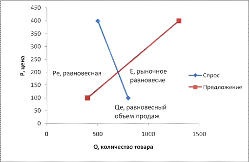 3. Построим график рыночного равновесия на холодильники за день по точкам из шкалы. Для кривой спроса возьмём точки: Р1 = 100, Q1 = 800; Р2 = 400, Q2 = 500.
