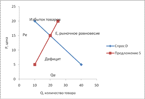 Задача 2. Постройте график рыночного равновесия, определите равновесную цену и объём продаж. Определите и посчитайте дефицит и избыток товаров при ценах: 5, 15, 20.