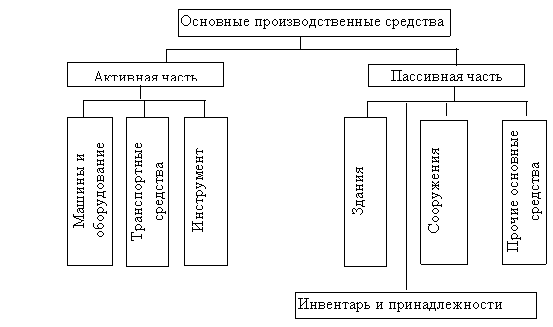 Активная часть основных средств воздействует на предметы труда, перемещает их в производственном процессе и осуществляет контроль над ходом производства. Пассивная часть создает условия для бесперебойного функционирования активной части.