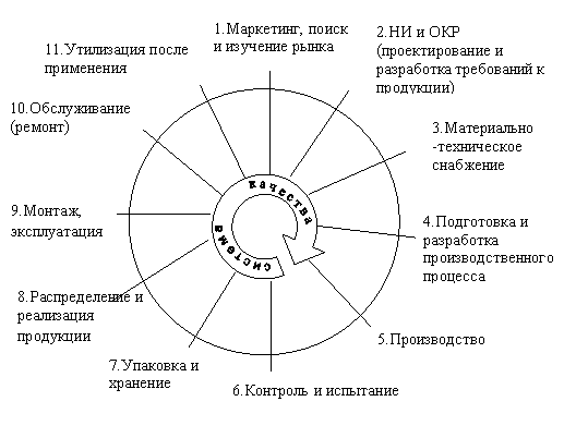 В тоже время в условиях требований рынка стало недостаточным контролировать качество конечного продукта и отдельных стадий производственного процесса. Необходимым условием выживания в конкурентной борьбе стало создание системы качества, охватывающей все стадии производства, которые оказывают влияние на качество готового изделия, то есть от заключения контракта с поставщиками материалов, сырья до сбыта готовой продукции производителем и утилизацией изношенных изделий по ликвидационной стоимости потребителем.
