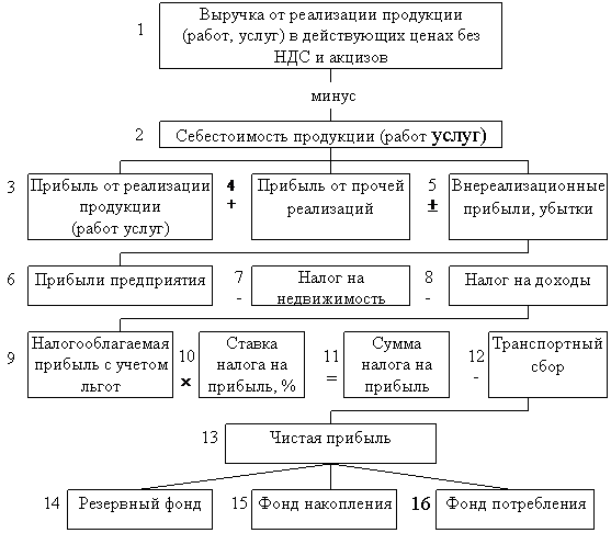 Чистая прибыль рассчитывается как разность: прибыль фактическая минус налог на недвижимость, минус налог на доходы, минус налог на прибыль, минус транспортный сбор по ставке 5%. Заключительным этапом распределения чистой прибыли (оставшейся в распоряжении предприятия), является установление направлений ее использования.