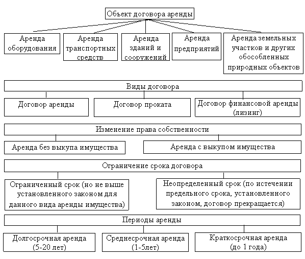 Преимуществом арендных отношений является предоставление возможности арендатору в случае, если необходимость в использовании имущества исчезает, передать с согласия арендодателя права и обязанности по договору аренды другому лицу, то есть заключить договор субаренды. Срок действия договора субаренды не может превышать периода действия договора аренды. Виды аренды иллюстрирует рисунок 14.3.