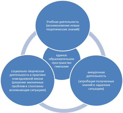 Единое образовательное пространство гимназии включает учебную деятельность как этап возникновения новых теоретических знаний, внеурочную деятельность по апробации полученных знаний в заданных ситуациях и социально-творческую деятельность в практике повседневной жизни как этап решения жизненных проблем в спонтанно возникающих ситуациях.