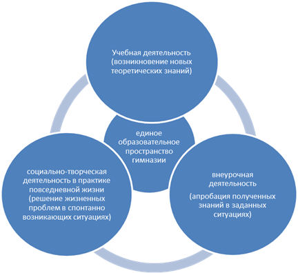 Гимназия имеет большой опыт работы по модели единого образовательного пространства, включающего в себя урочную деятельность как этап возникновения новых теоретических знаний, внеурочную деятельность по апробации полученных знаний в заданных ситуациях и социально-творческую деятельность в практике повседневной жизни как этап решения жизненных проблем в спонтанно возникающих ситуациях.