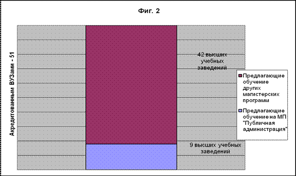 o соотношение между 9-тью ВУЗами, предлагающими обучение по Магистерской программе «Публичная администрация» и 42-мя акредитированными ВУЗами в Республике Болгария, предлагающими другие магистерские программы в 2009г. показывает, приблизительно 1:5(фиг.2)
