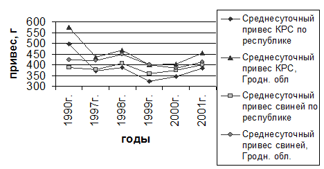Рис. 4. Продуктивность (привес) скота в колхозах и госхозах Гродненской области.