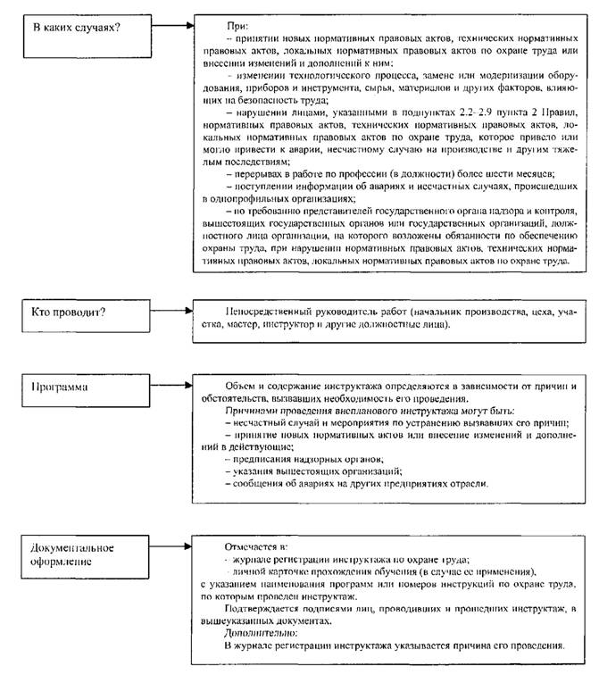Внеплановый инструктаж проводится также по требованию органа надзора и контроля, вышестоящих государственных органов или государственных организаций, должностного лица организации, на которого возложены обязанности по обеспечению охраны труда, при нарушении нормативных правовых актов, технических нормативных правовых актов, локальных нормативных правовых актов по охране труда.