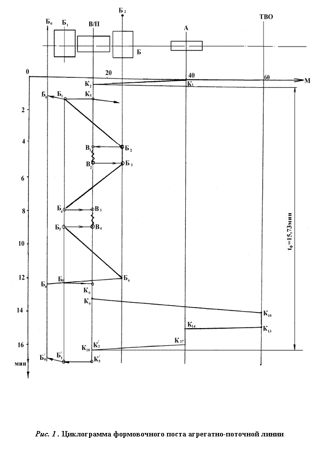 7. Отличие циклограммы полуконвейерной линии от конвейерной в том, что необходимо учесть работы на первом посту по установке формы принятым подъемно-транспортным механизмом после перемещения ее с этого поста приводом полуконвейера; на последнем посту необходимо предусмотреть съем формы с изделием до начала передвижения формы с предыдущего поста.