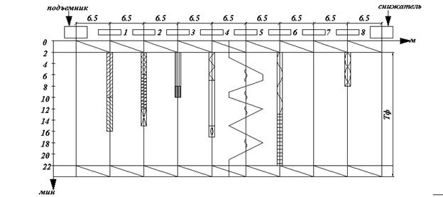 4. Осями циклограммы служат линия длины конвейера (полуконвейера) и времени (вертикально вниз). На горизонтальной линии отмечаются оси постов и подъемников-снижателей или передаточных тележек (для конвейерной линии).