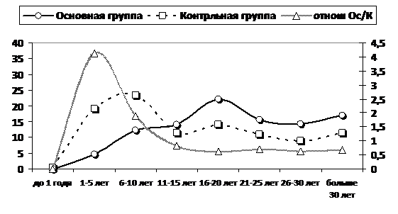 В ходе исследования было выяснено среднее количество лет установления инвалидности после начала заболевания (6,02±0,13 лет). Выявлена интересная динамика распределения длительности заболевания в сравниваемых группах (рис. 1)