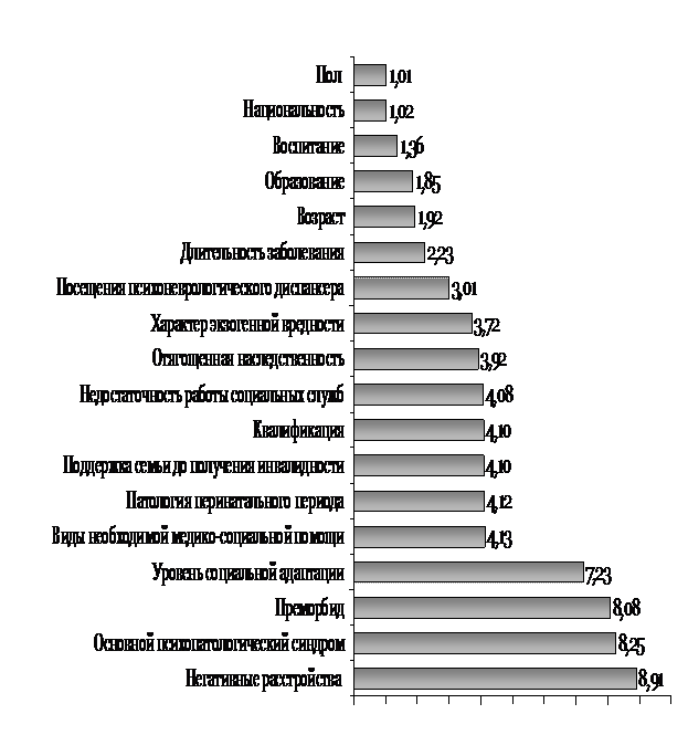 ¾ социальные факторы - необходимость поддерживающей терапии (ИО=4,50); отсутствие профессиональной квалификации (ИО=4,29); недостаточное внимание семьи к больному во время болезни (ИО=4,44); недостаток работы социальных служб (ИО=4,41); бездеятельность больного в плане социальной адаптации (ИО=4,06); начальное образование (ИО=2,04); несвоевременное посещение психоневрологического диспансера (ИО=3,25).