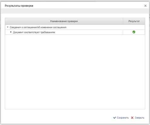 4) После прохождения всех контролей необходимо сохранить экземпляр формуляра «Сведения о соглашении/об изменении соглашения», нажав на кнопку «Сохранить» окна «Результаты проверки».