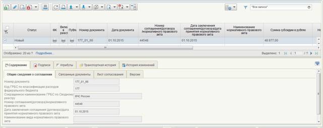 Рисунок 23. Статус документа «Сведения о соглашении/об изменении соглашения» – Новый