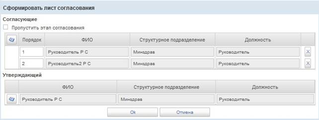 7) В открывшемся окне «Сформировать лист согласований» (Рисунок 24) заполнить сведения о согласующих и утверждающих лицах. Для этого с помощью кнопки