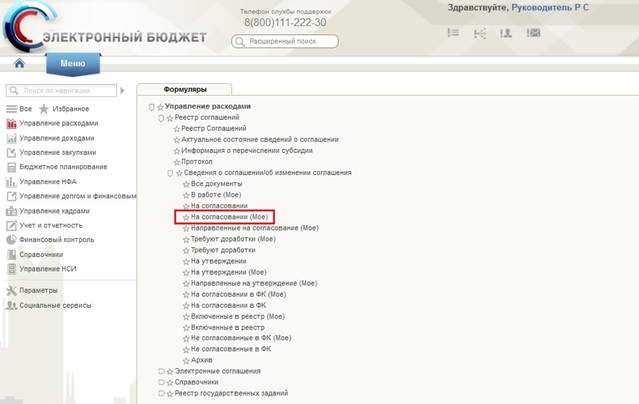 1) Выбрать в пункте меню «На согласовании (Мое)» («Навигатор – Управление расходами – Реестр соглашений – Сведения о соглашении/об изменении соглашения») документ на статусе «на согласовании».