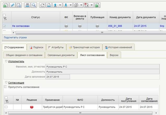 Документ изменит свой статус на «Не согласован», а в документе будет указана причина отклонения документа.