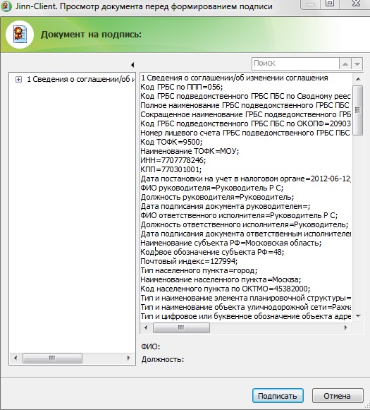 4) Выполнить подписание документа. Для этого необходимо в открывшемся окне «Документ на подпись» просмотреть подписываемый документ и нажать кнопку