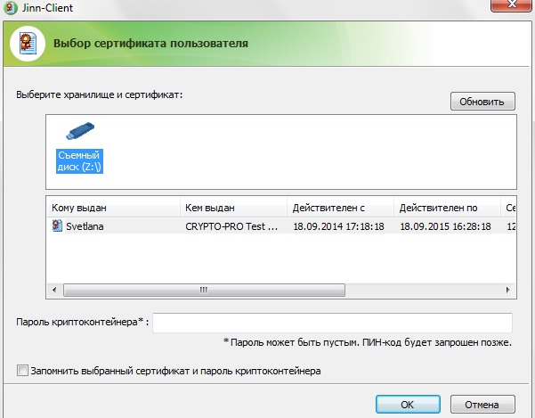 В окне «Выбор сертификата пользователя» выбрать сертификат и нажать кнопку «ОК» (Рисунок 33).