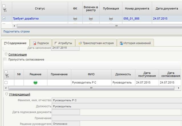 Документ изменит свой статус на «Требует доработки», а в документе будет указана причина доработки документа. Документ возвращается пользователю с ролью «Ответственный Исполнитель», который корректирует документ (п. 3.2.8), после чего документ заново проходит весь цикл согласования.