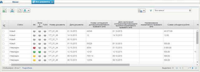 14. | Включенные в реестр | Отображаются экземпляры документов в статусе «Утвержден» и созданные текущим пользователем, для которых в фонарной группе «Включение в реестр» отражается зелёный сигнал. |