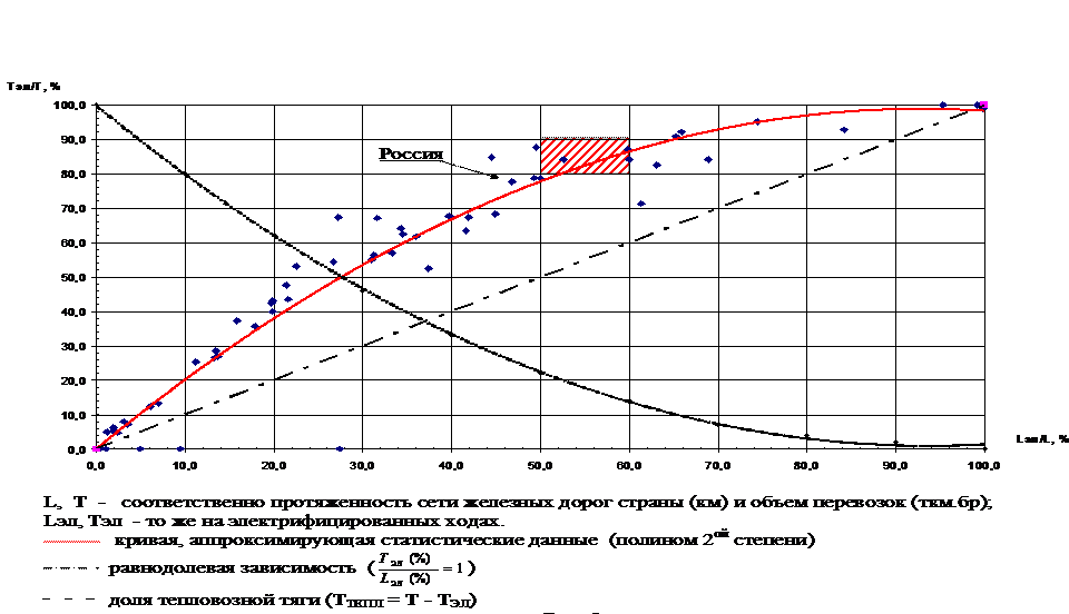 Статистическая зависимость доли относительного объема перевозок на электрической тяге (Тэл/Т) к удельной протяженности электрифицированных линий (Lэл/L) для развитых стран мира