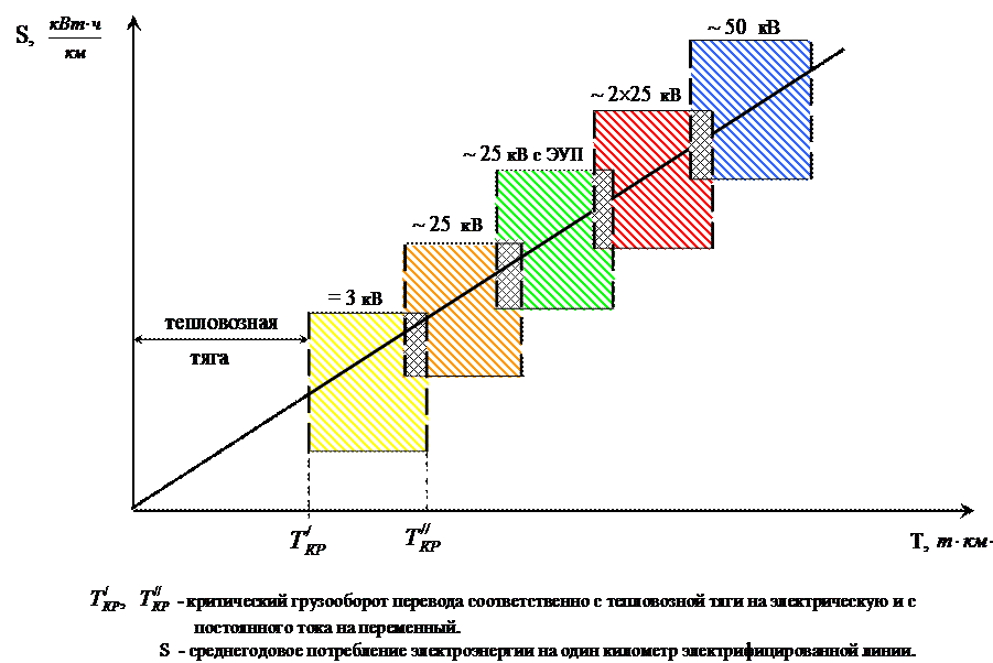 Принципиальная схема границ применения различных систем тягового электроснабжения по условиям оптимальной энергетической эффективности