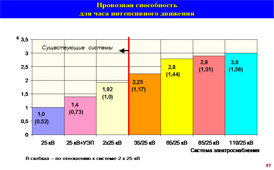 · системы тягового электроснабжения 35/25 кВ, 65/25 кВ, 85/25 кВ, 110/25 кВ, которые позволяют гибко подобрать энергетически эффективную СТЭ под размеры перевозок.