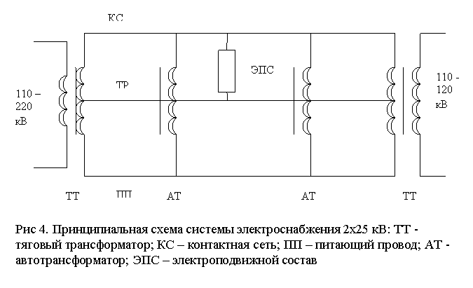 Схема электроснабжения однофазного тока промышленной частоты повышенного напряжения 2х25 кВ (автотрансформаторная трёхпроводная схема электроснабжения) сохраняет существующее электрооборудование 25 кВ (рис. 4). Электроэнергия к ЭПС передаётся напряжением 50 кВ на большей части межподстанционной зоны. ЭПС получает питание от автотрансформаторов (АТ) слева и справа напряжением 25 кВ от АТ.