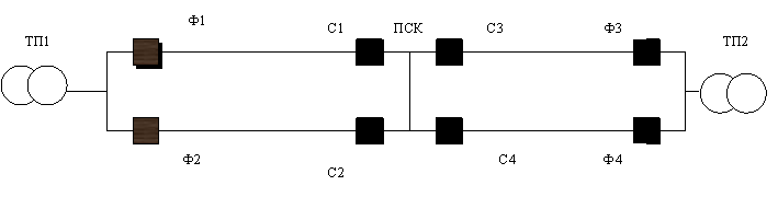 При схеме одностороннего питания КС до ПСК (раздельная работа смежных ТП) КС в середине участка между ТП делится на две секции нейтральной вставкой (НВ). При этом каждая секция питается от одной ТП через питающий провод (ФКС).