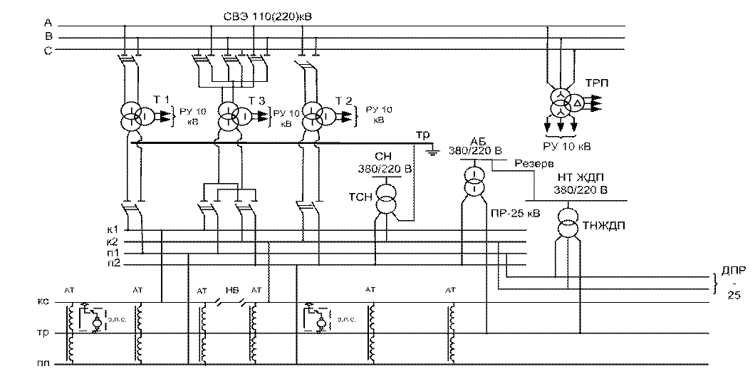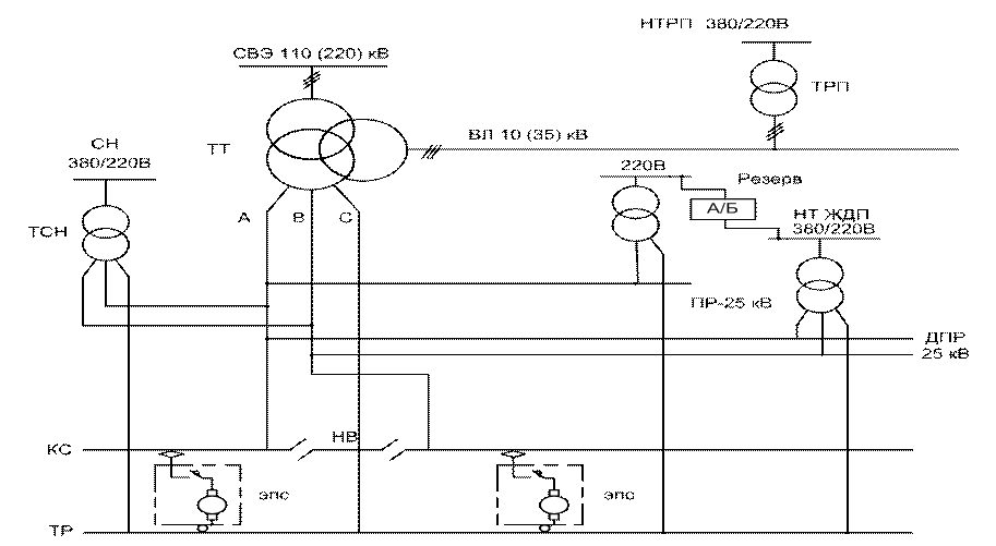 Схема электроснабжения потребителей электроэнергии от тяговой подстанции СТЭ 2х25 кВ: СВЭ – сеть внешнего электроснабжения 110(220) кВ; Т1, Т2, Т3 – однофазные тяговые трансформаторы; ТРП – трансформатор районных нетранспортных потребителей; АБ – автоблокировка (СЦБ); ПР-25 – однофазная система тягового электроснабжения автоблокировки провод - рельс ( ВЛ СЦБ); ДПР-25 – трёхфазная система электроснабжения два провода – рельс для питания нетяговых ЖД потребителей; АТ – автотрансформатор; КС – контактная сеть 25 кВ; ТР – тяговый рельс; ПП – питающий провод; ТТ – тяговый рельс; НВ – нейтральная вставка; ТСН – трансформатор собственных нужд; ЭПС – электровоз.