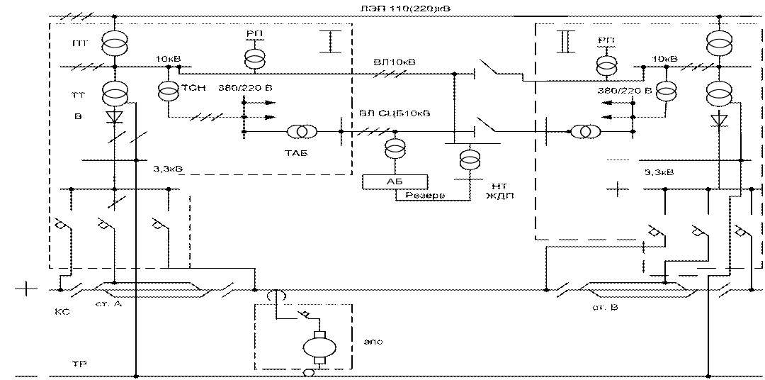 Cхема электроснабжения потребителей от тяговой подстанции СТЭ постоянного тока U=3 кВ: ЛЭП – сеть внешнего электроснабжения 110(220) кВ; ЭПС – электроподвижной состав; ПТ – понизительный трёхфазный трансформатор; В – выпрямитель переменного тока в постоянный 3.3 кВ; ВЛ 10 кВ - трёхфазная высоковольтная линия 10 кВ для питания нетяговых железнодорожных потребителей НТЖДП; ВЛ СЦБ 10 кВ – трёхфазная высоковольтная линия 10 кВ для питания потребителей автоблокировки АБ; ТСН - трансформатор собственных нужд 380/220 В; ТАБ – трансформатор автоблокировки 220В/10 кВ; КС – контактная сеть 3 кВ; ТР – тяговый рельс.