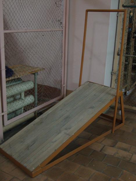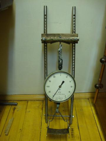 расположенных направляющих, скреплённых внизу осью, а в верхней части подвижным деревянным бруском, являющимся опорой для верхней части коленного сустава. Одновременно с бруском перемещается связанный с ним кронштейн, на который подвешивается динамометр ДПУ-2-2 ГОСТ 13837-79. Крюк динамометра зацепляется за дугу, на которой подвешено стремя.