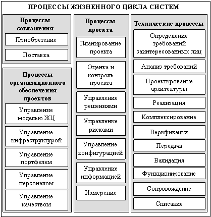 Методы системной инженерии позволяют задать единую структуру для установления и развития связей и кооперации между сторонами, создающими и использующими современные системы и управляющими ими, на основе моделирования, и реализации общих процессов, составляющих ЖЦ систем, с возможностью для их оценки и совершенствования. Кроме того, в рамках системной инженерии формируется единый методологический базис для описания всех процессов ЖЦ систем, куда, согласно стандарту ISO/IEC 15288:2008, входят 4 группы процессов – технические, проектные, организационного обеспечения проектов (процессы предприятия) и соглашения (рис.2).