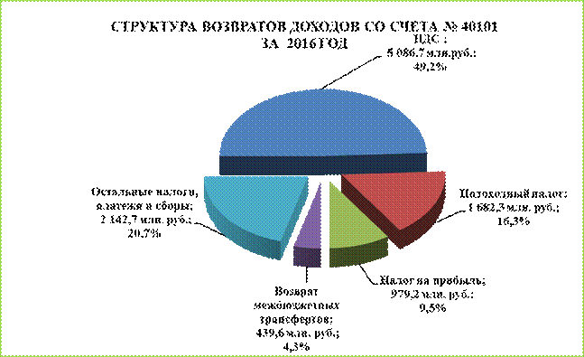 Возвращено плательщикам со счета № 40101 Управления на основании Заявок на возврат и Уведомлений о межрегиональном зачете, представленных администраторами доходов бюджетов, 10 330,5 млн. руб. (4,3 % от общей суммы поступлений). Из них 5 086,7 млн. руб. или 49,2% составили возвраты НДС; 1 682,3 млн. руб. (16,3%) – возвраты подоходного налога; 979,2 млн. руб. (9,5%) – возвраты налога на прибыль. Возврат неиспользованных остатков межбюджетных трансфертов, предоставленных из федерального бюджета бюджетам субъектов Российской Федерации и бюджетам государственных внебюджетных фондов, составил 439,6 млн. руб.(4,3%) (Диаграмма 2).