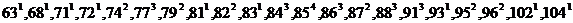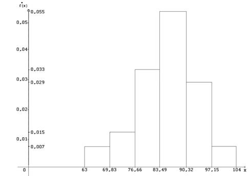 Границы интервалов | [63;69,83) | [69,83;76,66) | [76,66;83,49) | [83,49;90,32 | 90,32;97,15) | [97,15;104] |