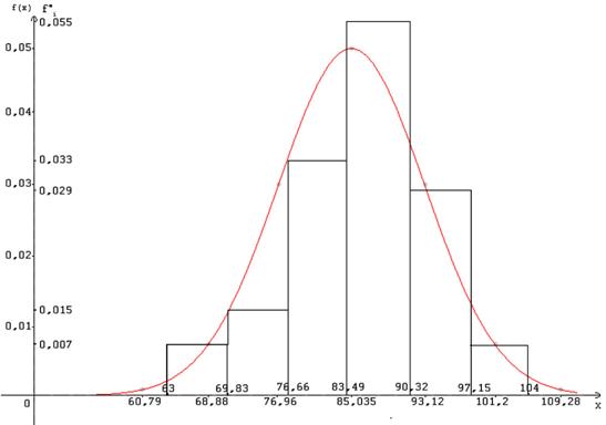 5) по результатам обработки выборочных данных выдвинуть гипотезу о нормальном распределении генеральной совокупности, например, по виду гистограммы, и выполнить ее проверку, используя правило «